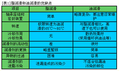 軸承的潤滑方法,大致可分為脂潤滑和油潤滑。為了充分發(fā)揮軸承的性能,根據(jù)使用條件和使用目的,選擇適當(dāng)?shù)臐櫥绞绞种匾?SPAN lang=EN-US>[表1]列出了脂潤滑和油潤滑的優(yōu)缺點(diǎn)。